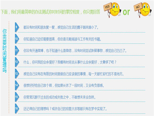 培训从一场有趣的时间管理测试睁开,,,,,,,通过有趣的问答让各人快速进入情境,,,,,,,加深对培训须要性的认知。。。。。。时间和才华是我们一生拥有的两大财产,,,,,,,但若是随着时间的流逝,,,,,,,ga黄金甲平台才华并没有增添,,,,,,,这就是虚度了时光。。。。。。只有我们妥善安排并使用好时间,,,,,,,通过实现人生旅途中一个个小目的,,,,,,,才华最终实现自己的人生大目的,,,,,,,实现妄想中的理想生涯。。。。。。